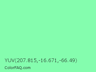 YUV 207.815,-16.671,-66.49 Color is a light green color and the nearest color is Mint Green #98ff98. Hex code #84fdae and RGB value is rgb(132,253,174). In RGB color space, this color is composed of 52% red, 99% green, 68% blue, In CMYK color space, this color is composed of 48% cyan, 0% magenta, 31% yellow , 1% black , In HSL color space, this color has a hue angle of 141° , 97% saturation and 75% lightness.