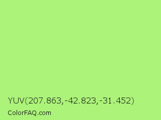 YUV 207.863,-42.823,-31.452 Color is a light green color and the nearest color is Sulu #c1f07c. Hex code #acf379 and RGB value is rgb(172,243,121). In RGB color space, this color is composed of 67% red, 95% green, 47% blue, In CMYK color space, this color is composed of 29% cyan, 0% magenta, 50% yellow , 5% black , In HSL color space, this color has a hue angle of 95° , 84% saturation and 71% lightness.