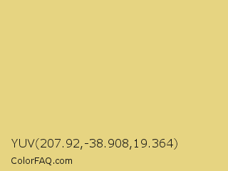 YUV 207.92,-38.908,19.364 Color is a light yellow color and the nearest color is Flax #eedc82. Hex code #e6d481 and RGB value is rgb(230,212,129). In RGB color space, this color is composed of 90% red, 83% green, 51% blue, In CMYK color space, this color is composed of 0% cyan, 8% magenta, 44% yellow , 10% black , In HSL color space, this color has a hue angle of 49° , 67% saturation and 70% lightness.