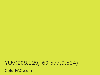 YUV 208.129,-69.577,9.534 Color is a normal yellow color and the nearest color is Maximum Green Yellow #d9e650. Hex code #dbe643 and RGB value is rgb(219,230,67). In RGB color space, this color is composed of 86% red, 90% green, 26% blue, In CMYK color space, this color is composed of 5% cyan, 0% magenta, 71% yellow , 10% black , In HSL color space, this color has a hue angle of 64° , 77% saturation and 58% lightness.