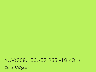 YUV 208.156,-57.265,-19.431 Color is a light green color and the nearest color is Inchworm #b2ec5d. Hex code #baf25c and RGB value is rgb(186,242,92). In RGB color space, this color is composed of 73% red, 95% green, 36% blue, In CMYK color space, this color is composed of 23% cyan, 0% magenta, 62% yellow , 5% black , In HSL color space, this color has a hue angle of 82° , 85% saturation and 65% lightness.