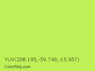 YUV 208.195,-59.749,-15.957 Color is a light green color and the nearest color is Inchworm #b2ec5d. Hex code #bef157 and RGB value is rgb(190,241,87). In RGB color space, this color is composed of 75% red, 95% green, 34% blue, In CMYK color space, this color is composed of 21% cyan, 0% magenta, 64% yellow , 5% black , In HSL color space, this color has a hue angle of 80° , 85% saturation and 64% lightness.