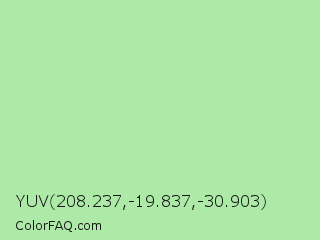 YUV 208.237,-19.837,-30.903 Color is a light green color and the nearest color is Granny Smith Apple #a8e4a0. Hex code #adeaa8 and RGB value is rgb(173,234,168). In RGB color space, this color is composed of 68% red, 92% green, 66% blue, In CMYK color space, this color is composed of 26% cyan, 0% magenta, 28% yellow , 8% black , In HSL color space, this color has a hue angle of 115° , 61% saturation and 79% lightness.