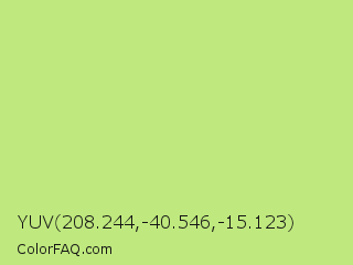 YUV 208.244,-40.546,-15.123 Color is a light green color and the nearest color is Sulu #c1f07c. Hex code #bfe97e and RGB value is rgb(191,233,126). In RGB color space, this color is composed of 75% red, 91% green, 49% blue, In CMYK color space, this color is composed of 18% cyan, 0% magenta, 46% yellow , 9% black , In HSL color space, this color has a hue angle of 84° , 71% saturation and 70% lightness.
