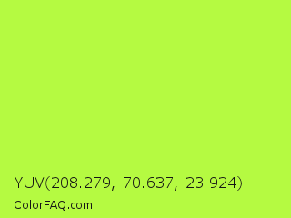 YUV 208.279,-70.637,-23.924 Color is a light green color and the nearest color is Green Yellow #adff2f. Hex code #b5fa41 and RGB value is rgb(181,250,65). In RGB color space, this color is composed of 71% red, 98% green, 25% blue, In CMYK color space, this color is composed of 28% cyan, 0% magenta, 74% yellow , 2% black , In HSL color space, this color has a hue angle of 82° , 95% saturation and 62% lightness.