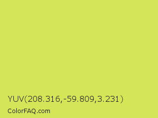 YUV 208.316,-59.809,3.231 Color is a light yellow color and the nearest color is Maximum Green Yellow #d9e650. Hex code #d4e657 and RGB value is rgb(212,230,87). In RGB color space, this color is composed of 83% red, 90% green, 34% blue, In CMYK color space, this color is composed of 8% cyan, 0% magenta, 62% yellow , 10% black , In HSL color space, this color has a hue angle of 68° , 74% saturation and 62% lightness.