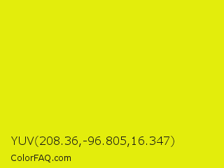 YUV 208.36,-96.805,16.347 Color is a normal yellow color and the nearest color is Piss Yellow #e1e115. Hex code #e3ed0c and RGB value is rgb(227,237,12). In RGB color space, this color is composed of 89% red, 93% green, 5% blue, In CMYK color space, this color is composed of 4% cyan, 0% magenta, 95% yellow , 7% black , In HSL color space, this color has a hue angle of 63° , 90% saturation and 49% lightness.