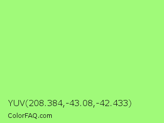 YUV 208.384,-43.08,-42.433 Color is a light green color and the nearest color is Light Green #90ee90. Hex code #a0fa79 and RGB value is rgb(160,250,121). In RGB color space, this color is composed of 63% red, 98% green, 47% blue, In CMYK color space, this color is composed of 36% cyan, 0% magenta, 52% yellow , 2% black , In HSL color space, this color has a hue angle of 102° , 93% saturation and 73% lightness.