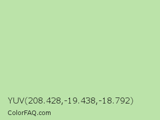 YUV 208.428,-19.438,-18.792 Color is a light green color and the nearest color is Moss Green #addfad. Hex code #bbe3a9 and RGB value is rgb(187,227,169). In RGB color space, this color is composed of 73% red, 89% green, 66% blue, In CMYK color space, this color is composed of 18% cyan, 0% magenta, 26% yellow , 11% black , In HSL color space, this color has a hue angle of 101° , 51% saturation and 78% lightness.