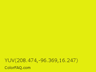 YUV 208.474,-96.369,16.247 Color is a normal yellow color and the nearest color is Piss Yellow #e1e115. Hex code #e3ed0d and RGB value is rgb(227,237,13). In RGB color space, this color is composed of 89% red, 93% green, 5% blue, In CMYK color space, this color is composed of 4% cyan, 0% magenta, 95% yellow , 7% black , In HSL color space, this color has a hue angle of 63° , 90% saturation and 49% lightness.