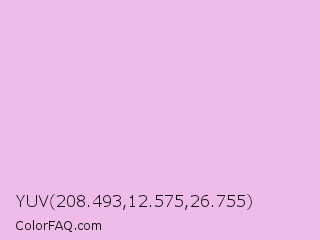 YUV 208.493,12.575,26.755 Color is a very light magenta color and the nearest color is French Lilac #ecc7ee. Hex code #efbcea and RGB value is rgb(239,188,234). In RGB color space, this color is composed of 94% red, 74% green, 92% blue, In CMYK color space, this color is composed of 0% cyan, 21% magenta, 2% yellow , 6% black , In HSL color space, this color has a hue angle of 306° , 61% saturation and 84% lightness.