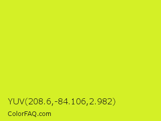 YUV 208.6,-84.106,2.982 Color is a normal yellow color and the nearest color is Pear #d1e231. Hex code #d4f026 and RGB value is rgb(212,240,38). In RGB color space, this color is composed of 83% red, 94% green, 15% blue, In CMYK color space, this color is composed of 12% cyan, 0% magenta, 84% yellow , 6% black , In HSL color space, this color has a hue angle of 68° , 87% saturation and 55% lightness.