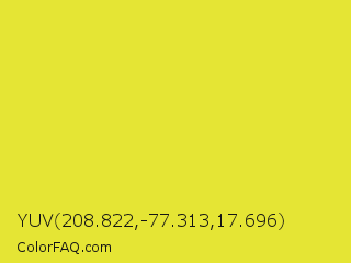 YUV 208.822,-77.313,17.696 Color is a normal yellow color and the nearest color is Dandelion #f0e130. Hex code #e5e534 and RGB value is rgb(229,229,52). In RGB color space, this color is composed of 90% red, 90% green, 20% blue, In CMYK color space, this color is composed of 0% cyan, 0% magenta, 77% yellow , 10% black , In HSL color space, this color has a hue angle of 60° , 77% saturation and 55% lightness.