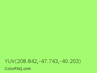 YUV 208.842,-47.743,-40.203 Color is a light green color and the nearest color is Inchworm #b2ec5d. Hex code #a3fb70 and RGB value is rgb(163,251,112). In RGB color space, this color is composed of 64% red, 98% green, 44% blue, In CMYK color space, this color is composed of 35% cyan, 0% magenta, 55% yellow , 2% black , In HSL color space, this color has a hue angle of 98° , 95% saturation and 71% lightness.