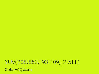 YUV 208.863,-93.109,-2.511 Color is a normal lime color and the nearest color is Arctic Lime #d0ff14. Hex code #cef714 and RGB value is rgb(206,247,20). In RGB color space, this color is composed of 81% red, 97% green, 8% blue, In CMYK color space, this color is composed of 17% cyan, 0% magenta, 92% yellow , 3% black , In HSL color space, this color has a hue angle of 71° , 93% saturation and 52% lightness.