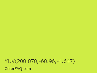 YUV 208.878,-68.96,-1.647 Color is a normal lime color and the nearest color is Maximum Green Yellow #d9e650. Hex code #cfed45 and RGB value is rgb(207,237,69). In RGB color space, this color is composed of 81% red, 93% green, 27% blue, In CMYK color space, this color is composed of 13% cyan, 0% magenta, 71% yellow , 7% black , In HSL color space, this color has a hue angle of 71° , 82% saturation and 60% lightness.