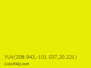 YUV 208.943,-101.037,20.221 Color is a normal yellow color and the nearest color is Titanium Yellow #eee600. Hex code #e8ed04 and RGB value is rgb(232,237,4). In RGB color space, this color is composed of 91% red, 93% green, 2% blue, In CMYK color space, this color is composed of 2% cyan, 0% magenta, 98% yellow , 7% black , In HSL color space, this color has a hue angle of 61° , 97% saturation and 47% lightness.