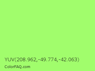 YUV 208.962,-49.774,-42.063 Color is a light green color and the nearest color is Inchworm #b2ec5d. Hex code #a1fd6c and RGB value is rgb(161,253,108). In RGB color space, this color is composed of 63% red, 99% green, 42% blue, In CMYK color space, this color is composed of 36% cyan, 0% magenta, 57% yellow , 1% black , In HSL color space, this color has a hue angle of 98° , 97% saturation and 71% lightness.