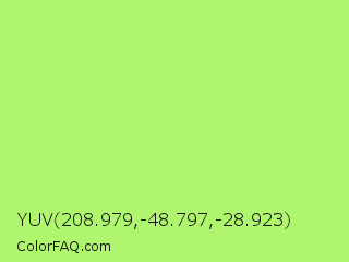 YUV 208.979,-48.797,-28.923 Color is a light green color and the nearest color is Inchworm #b2ec5d. Hex code #b0f56e and RGB value is rgb(176,245,110). In RGB color space, this color is composed of 69% red, 96% green, 43% blue, In CMYK color space, this color is composed of 28% cyan, 0% magenta, 55% yellow , 4% black , In HSL color space, this color has a hue angle of 91° , 87% saturation and 70% lightness.