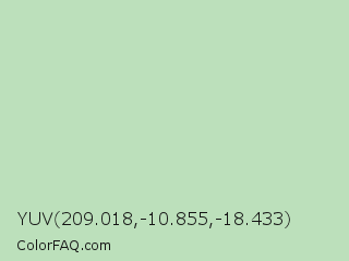 YUV 209.018,-10.855,-18.433 Color is a very light green color and the nearest color is Pixie Green #c0d8b6. Hex code #bce0bb and RGB value is rgb(188,224,187). In RGB color space, this color is composed of 74% red, 88% green, 73% blue, In CMYK color space, this color is composed of 16% cyan, 0% magenta, 17% yellow , 12% black , In HSL color space, this color has a hue angle of 118° , 37% saturation and 81% lightness.