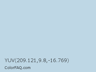 YUV 209.121,9.8,-16.769 Color is a very light blue color and the nearest color is Pale Aqua #bcd4e6. Hex code #bed7e5 and RGB value is rgb(190,215,229). In RGB color space, this color is composed of 75% red, 84% green, 90% blue, In CMYK color space, this color is composed of 17% cyan, 6% magenta, 0% yellow , 10% black , In HSL color space, this color has a hue angle of 202° , 43% saturation and 82% lightness.