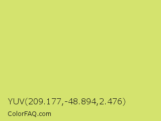 YUV 209.177,-48.894,2.476 Color is a light yellow color and the nearest color is Booger Buster #dde26a. Hex code #d4e36e and RGB value is rgb(212,227,110). In RGB color space, this color is composed of 83% red, 89% green, 43% blue, In CMYK color space, this color is composed of 7% cyan, 0% magenta, 52% yellow , 11% black , In HSL color space, this color has a hue angle of 68° , 68% saturation and 66% lightness.