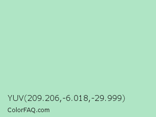 YUV 209.206,-6.018,-29.999 Color is a light green color and the nearest color is Padua #ade6c4. Hex code #afe5c5 and RGB value is rgb(175,229,197). In RGB color space, this color is composed of 69% red, 90% green, 77% blue, In CMYK color space, this color is composed of 24% cyan, 0% magenta, 14% yellow , 10% black , In HSL color space, this color has a hue angle of 144° , 51% saturation and 79% lightness.