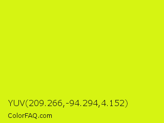 YUV 209.266,-94.294,4.152 Color is a normal yellow color and the nearest color is Arctic Lime #d0ff14. Hex code #d6f412 and RGB value is rgb(214,244,18). In RGB color space, this color is composed of 84% red, 96% green, 7% blue, In CMYK color space, this color is composed of 12% cyan, 0% magenta, 93% yellow , 4% black , In HSL color space, this color has a hue angle of 68° , 91% saturation and 51% lightness.