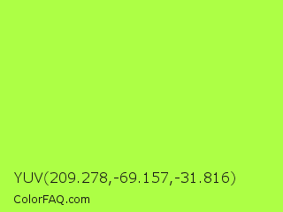 YUV 209.278,-69.157,-31.816 Color is a light green color and the nearest color is French Lime #9efd38. Hex code #adff45 and RGB value is rgb(173,255,69). In RGB color space, this color is composed of 68% red, 100% green, 27% blue, In CMYK color space, this color is composed of 32% cyan, 0% magenta, 73% yellow , 0% black , In HSL color space, this color has a hue angle of 86° , 100% saturation and 64% lightness.