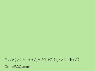 YUV 209.337,-24.816,-20.467 Color is a light green color and the nearest color is Granny Smith Apple #a8e4a0. Hex code #bae79f and RGB value is rgb(186,231,159). In RGB color space, this color is composed of 73% red, 91% green, 62% blue, In CMYK color space, this color is composed of 19% cyan, 0% magenta, 31% yellow , 9% black , In HSL color space, this color has a hue angle of 98° , 60% saturation and 76% lightness.