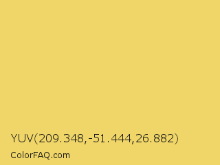 YUV 209.348,-51.444,26.882 Color is a light yellow color and the nearest color is Hansa Yellow #e9d66b. Hex code #f0d669 and RGB value is rgb(240,214,105). In RGB color space, this color is composed of 94% red, 84% green, 41% blue, In CMYK color space, this color is composed of 0% cyan, 11% magenta, 56% yellow , 6% black , In HSL color space, this color has a hue angle of 48° , 82% saturation and 68% lightness.