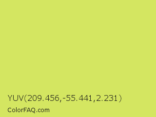 YUV 209.456,-55.441,2.231 Color is a light yellow color and the nearest color is Booger Buster #dde26a. Hex code #d4e661 and RGB value is rgb(212,230,97). In RGB color space, this color is composed of 83% red, 90% green, 38% blue, In CMYK color space, this color is composed of 8% cyan, 0% magenta, 58% yellow , 10% black , In HSL color space, this color has a hue angle of 68° , 73% saturation and 64% lightness.