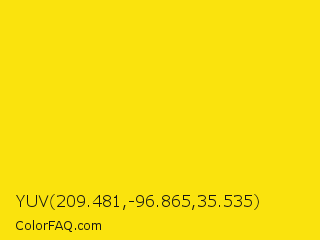 YUV 209.481,-96.865,35.535 Color is a normal yellow color and the nearest color is Lemon #fde910. Hex code #fae30d and RGB value is rgb(250,227,13). In RGB color space, this color is composed of 98% red, 89% green, 5% blue, In CMYK color space, this color is composed of 0% cyan, 9% magenta, 95% yellow , 2% black , In HSL color space, this color has a hue angle of 54° , 96% saturation and 52% lightness.