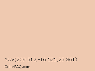 YUV 209.512,-16.521,25.861 Color is a very light orange color and the nearest color is Desert Sand #edc9af. Hex code #efc9b0 and RGB value is rgb(239,201,176). In RGB color space, this color is composed of 94% red, 79% green, 69% blue, In CMYK color space, this color is composed of 0% cyan, 16% magenta, 26% yellow , 6% black , In HSL color space, this color has a hue angle of 24° , 66% saturation and 81% lightness.