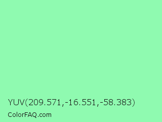 YUV 209.571,-16.551,-58.383 Color is a light green color and the nearest color is Teal Deer #99e6b3. Hex code #8ffab0 and RGB value is rgb(143,250,176). In RGB color space, this color is composed of 56% red, 98% green, 69% blue, In CMYK color space, this color is composed of 43% cyan, 0% magenta, 30% yellow , 2% black , In HSL color space, this color has a hue angle of 139° , 91% saturation and 77% lightness.