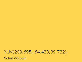 YUV 209.695,-64.433,39.732 Color is a light orange color and the nearest color is Mustard #ffdb58. Hex code #ffd44f and RGB value is rgb(255,212,79). In RGB color space, this color is composed of 100% red, 83% green, 31% blue, In CMYK color space, this color is composed of 0% cyan, 17% magenta, 69% yellow , 0% black , In HSL color space, this color has a hue angle of 45° , 100% saturation and 65% lightness.