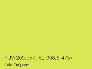 YUV 209.757,-61.998,5.475 Color is a light yellow color and the nearest color is Maximum Green Yellow #d9e650. Hex code #d8e754 and RGB value is rgb(216,231,84). In RGB color space, this color is composed of 85% red, 91% green, 33% blue, In CMYK color space, this color is composed of 6% cyan, 0% magenta, 64% yellow , 9% black , In HSL color space, this color has a hue angle of 66° , 75% saturation and 62% lightness.