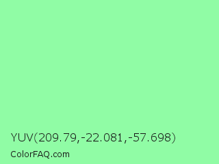 YUV 209.79,-22.081,-57.698 Color is a light green color and the nearest color is Pale Green #98fb98. Hex code #90fca5 and RGB value is rgb(144,252,165). In RGB color space, this color is composed of 56% red, 99% green, 65% blue, In CMYK color space, this color is composed of 43% cyan, 0% magenta, 35% yellow , 1% black , In HSL color space, this color has a hue angle of 132° , 95% saturation and 78% lightness.