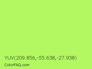 YUV 209.856,-55.638,-27.938 Color is a light green color and the nearest color is Inchworm #b2ec5d. Hex code #b2f861 and RGB value is rgb(178,248,97). In RGB color space, this color is composed of 70% red, 97% green, 38% blue, In CMYK color space, this color is composed of 28% cyan, 0% magenta, 61% yellow , 3% black , In HSL color space, this color has a hue angle of 88° , 92% saturation and 68% lightness.