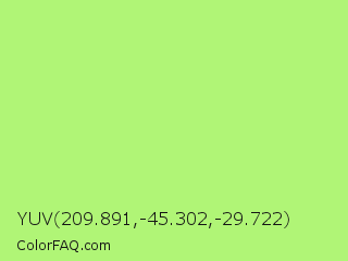 YUV 209.891,-45.302,-29.722 Color is a light green color and the nearest color is Sulu #c1f07c. Hex code #b0f576 and RGB value is rgb(176,245,118). In RGB color space, this color is composed of 69% red, 96% green, 46% blue, In CMYK color space, this color is composed of 28% cyan, 0% magenta, 52% yellow , 4% black , In HSL color space, this color has a hue angle of 93° , 86% saturation and 71% lightness.