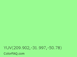 YUV 209.902,-31.997,-50.78 Color is a light green color and the nearest color is Pale Green #98fb98. Hex code #98fc91 and RGB value is rgb(152,252,145). In RGB color space, this color is composed of 60% red, 99% green, 57% blue, In CMYK color space, this color is composed of 40% cyan, 0% magenta, 42% yellow , 1% black , In HSL color space, this color has a hue angle of 116° , 95% saturation and 78% lightness.