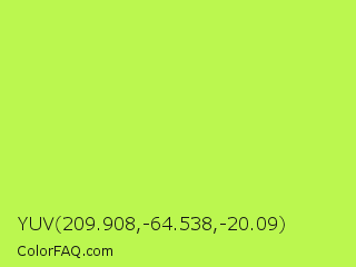 YUV 209.908,-64.538,-20.09 Color is a light green color and the nearest color is Inchworm #b2ec5d. Hex code #bbf74f and RGB value is rgb(187,247,79). In RGB color space, this color is composed of 73% red, 97% green, 31% blue, In CMYK color space, this color is composed of 24% cyan, 0% magenta, 68% yellow , 3% black , In HSL color space, this color has a hue angle of 81° , 91% saturation and 64% lightness.