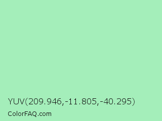 YUV 209.946,-11.805,-40.295 Color is a light green color and the nearest color is Chinook #a8e3bd. Hex code #a4eeba and RGB value is rgb(164,238,186). In RGB color space, this color is composed of 64% red, 93% green, 73% blue, In CMYK color space, this color is composed of 31% cyan, 0% magenta, 22% yellow , 7% black , In HSL color space, this color has a hue angle of 138° , 69% saturation and 79% lightness.