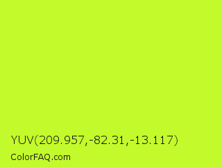 YUV 209.957,-82.31,-13.117 Color is a normal lime color and the nearest color is Green Yellow #adff2f. Hex code #c3fa2b and RGB value is rgb(195,250,43). In RGB color space, this color is composed of 76% red, 98% green, 17% blue, In CMYK color space, this color is composed of 22% cyan, 0% magenta, 83% yellow , 2% black , In HSL color space, this color has a hue angle of 76° , 95% saturation and 57% lightness.
