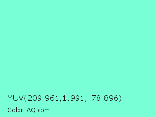 YUV 209.961,1.991,-78.896 Color is a light green color and the nearest color is Aquamarine #7fffd4. Hex code #78ffd6 and RGB value is rgb(120,255,214). In RGB color space, this color is composed of 47% red, 100% green, 84% blue, In CMYK color space, this color is composed of 53% cyan, 0% magenta, 16% yellow , 0% black , In HSL color space, this color has a hue angle of 162° , 100% saturation and 74% lightness.