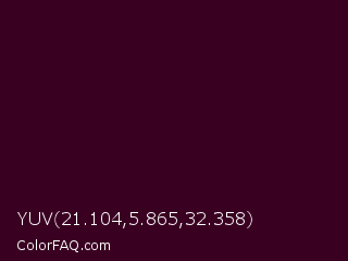 YUV 21.104,5.865,32.358 Color is a very dark magenta color and the nearest color is Toledo #3a0020. Hex code #3a0021 and RGB value is rgb(58,-0,33). In RGB color space, this color is composed of 23% red, 0% green, 13% blue, In CMYK color space, this color is composed of 0% cyan, 100% magenta, 43% yellow , 77% black , In HSL color space, this color has a hue angle of 326° , 100% saturation and 11% lightness.