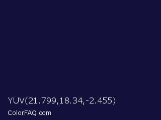 YUV 21.799,18.34,-2.455 Color is a very dark indigo color and the nearest color is Haiti #1b1035. Hex code #13103b and RGB value is rgb(19,16,59). In RGB color space, this color is composed of 7% red, 6% green, 23% blue, In CMYK color space, this color is composed of 68% cyan, 73% magenta, 0% yellow , 77% black , In HSL color space, this color has a hue angle of 244° , 57% saturation and 15% lightness.