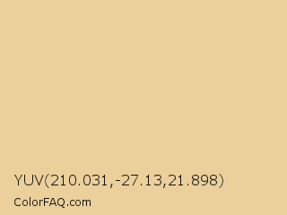 YUV 210.031,-27.13,21.898 Color is a light orange color and the nearest color is Zombie #e4d69b. Hex code #ebd09b and RGB value is rgb(235,208,155). In RGB color space, this color is composed of 92% red, 82% green, 61% blue, In CMYK color space, this color is composed of 0% cyan, 11% magenta, 34% yellow , 8% black , In HSL color space, this color has a hue angle of 40° , 67% saturation and 76% lightness.