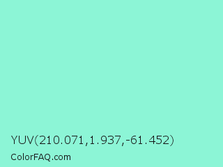 YUV 210.071,1.937,-61.452 Color is a light green color and the nearest color is Riptide #8be6d8. Hex code #8cf5d6 and RGB value is rgb(140,245,214). In RGB color space, this color is composed of 55% red, 96% green, 84% blue, In CMYK color space, this color is composed of 43% cyan, 0% magenta, 13% yellow , 4% black , In HSL color space, this color has a hue angle of 162° , 84% saturation and 75% lightness.