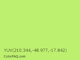 YUV 210.344,-48.977,-17.842 Color is a light green color and the nearest color is Sulu #c1f07c. Hex code #bef06f and RGB value is rgb(190,240,111). In RGB color space, this color is composed of 75% red, 94% green, 44% blue, In CMYK color space, this color is composed of 21% cyan, 0% magenta, 54% yellow , 6% black , In HSL color space, this color has a hue angle of 83° , 81% saturation and 69% lightness.